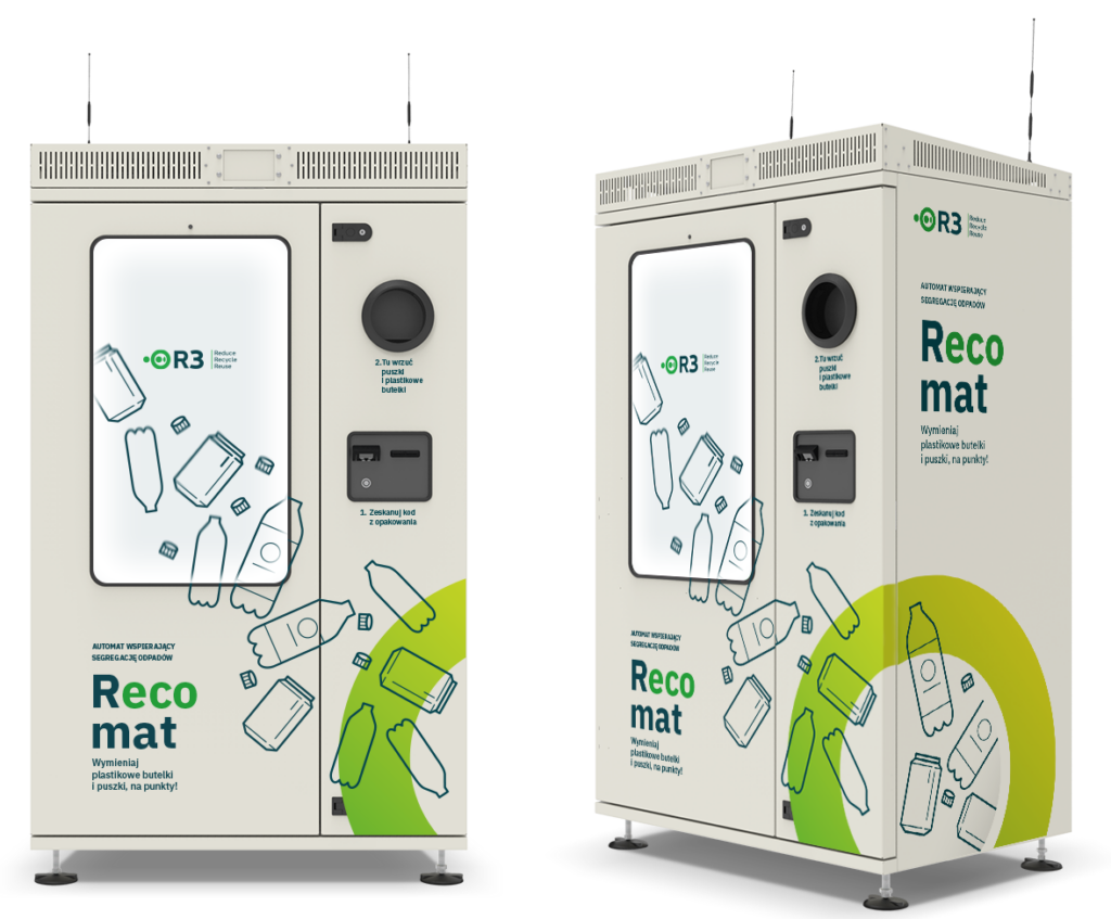 Smart RVM recycler for 3 fractions (PET bottles, aluminum cans and caps). Versions for internal and external use